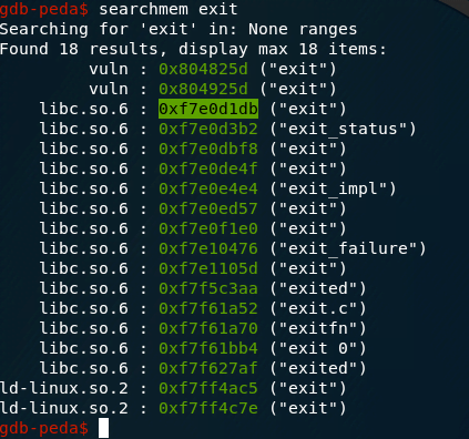 We can obtain the exit address by executing searchmem exit in gdb.